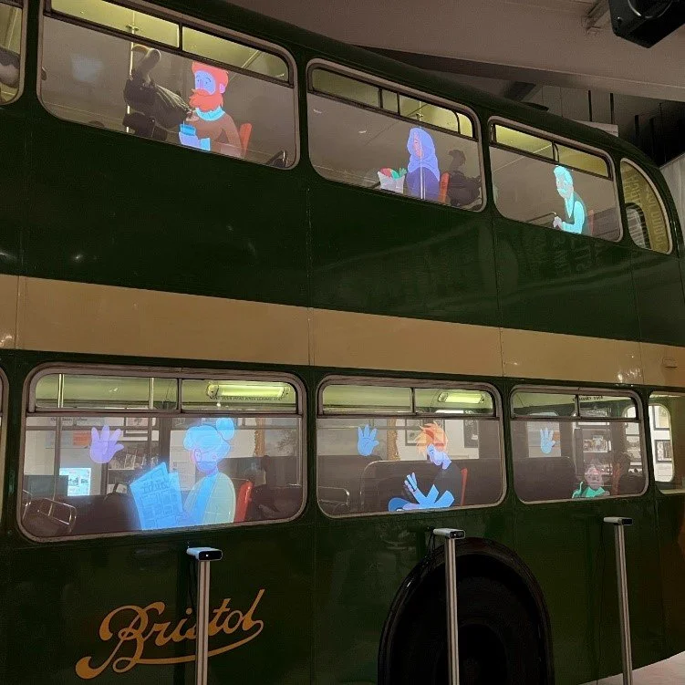 ‘Our Bristol Lodekka bus is a magnet for families at M Shed but the limited interaction allowed with it as a result of Covid restrictions proved disappointing for visitors. Animating the bus allowed us to provide a safe but playful intergenerational engagement opportunity, which is so important to the family audience, and to rebuild a level of interpretation appropriate for younger ages. The imaginary animated passengers react to visitor movement and provide snippets of conversation scripted to encourage visitors to locate objects and stories within the gallery. Projections of passengers on the upper floor windows also move and react to each other in a natural or humorous way. The animations are both fun, colourful and diverse and literally bring a huge inanimate object to life. In a nutshell they help us to illuminate more of Bristol’s many stories than those carried by the bus itself, and although Covid restrictions have now been relaxed they are an integral ingredient within the gallery that enable us to stimulate memories and discussions so as to create positive and memorable visits for all ages.’